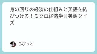 英語×専門分野クイズ 身の回りの経済の仕組みと英語を結びつける!ミクロ経済学×英語クイズ 英語を学ぶ意味が分からない?勉強してもどうせ使えない?こんなことを考えたことはありませんか?しかし、英語という言語はあくまでも道具で、本来は学習する人の世界を広げるためのツールでしかありません。一つの学問を追求しようとしたら、英語で書かれて... 2025.09.30 英語×専門分野クイズ