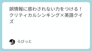 英語×専門分野クイズ 誤情報に惑わされない力をつける!クリティカルシンキング×英語クイズ 英語を学ぶ意味が分からない?勉強してもどうせ使えない?こんなことを考えたことはありませんか?しかし、英語という言語はあくまでも道具で、本来は学習する人の世界を広げるためのツールでしかありません。一つの学問を追求しようとしたら、英語で書かれて... 2025.10.03 英語×専門分野クイズ