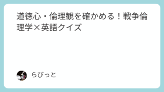 英語×専門分野クイズ 道徳心・倫理観を確かめる!戦争倫理学×英語クイズ 英語を学ぶ意味が分からない?勉強してもどうせ使えない?こんなことを考えたことはありませんか?しかし、英語という言語はあくまでも道具で、本来は学習する人の世界を広げるためのツールでしかありません。一つの学問を追求しようとしたら、英語で書かれて... 2025.10.05 英語×専門分野クイズ