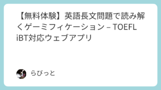試験対策-長文ウェブアプリ 【無料体験】英語長文問題で読み解くゲーミフィケーション – TOEFL iBT対応ウェブアプリ TOEFL iBTのリーディングセクションで心理学や人文系の専門用語に苦労していませんか?英検の長文対策を後回しにしていませんか?本記事では、実際の学術論文レベルの英語長文を使った無料練習アプリを提供します。段階的な学習で、複雑なゲーミフィケーションの概念を英語で理解できるようになります。 2025.12.06 試験対策-長文ウェブアプリ